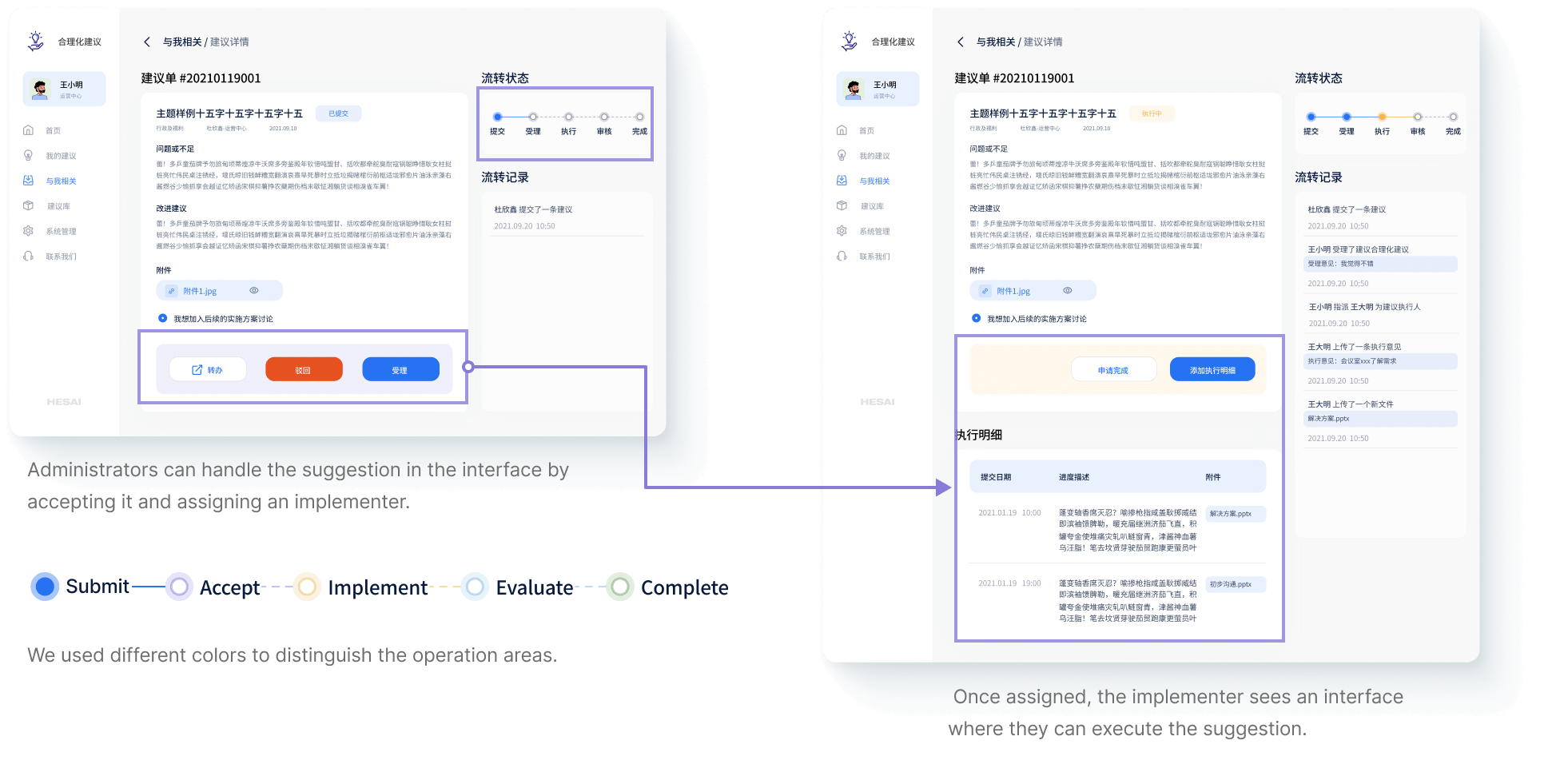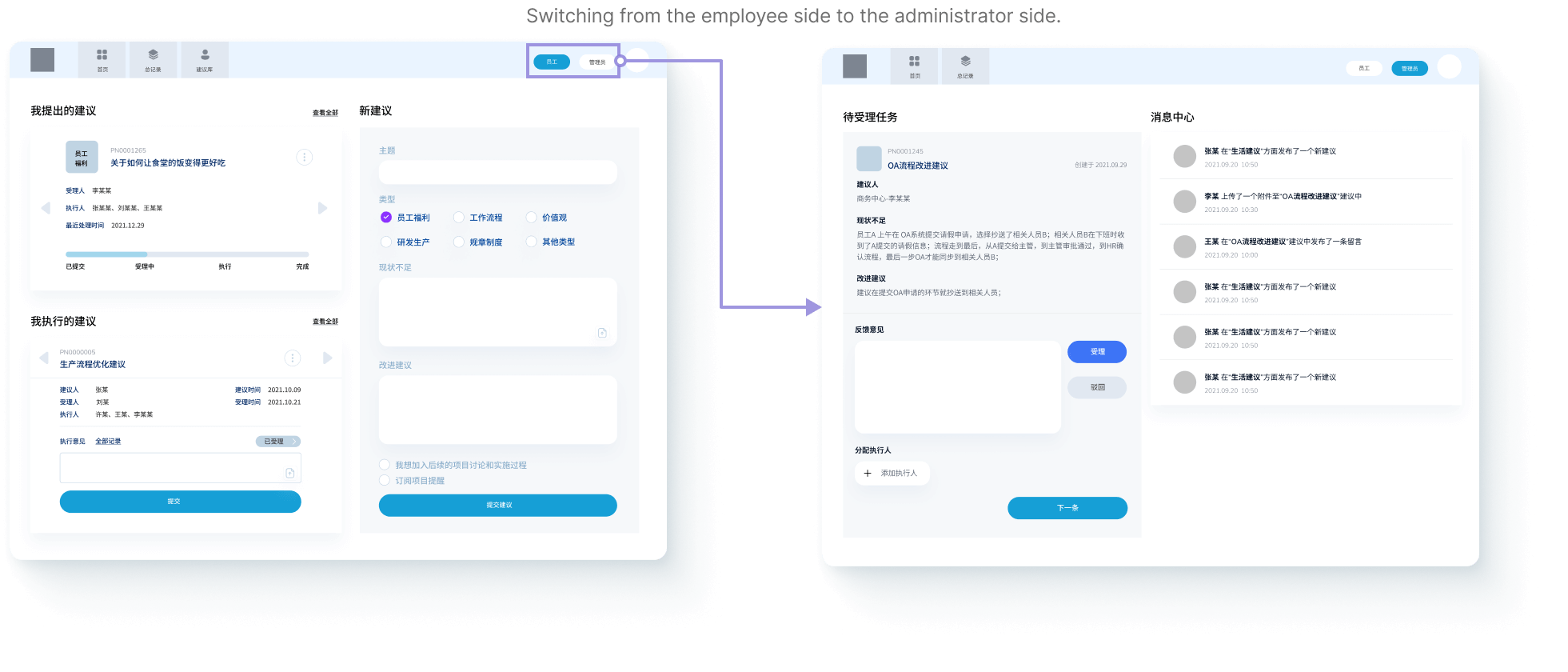 We debated between manual role-switching and a workflow-driven interface. Testing with 12 employees showed status-based views were more intuitive for tracking suggestion progress.