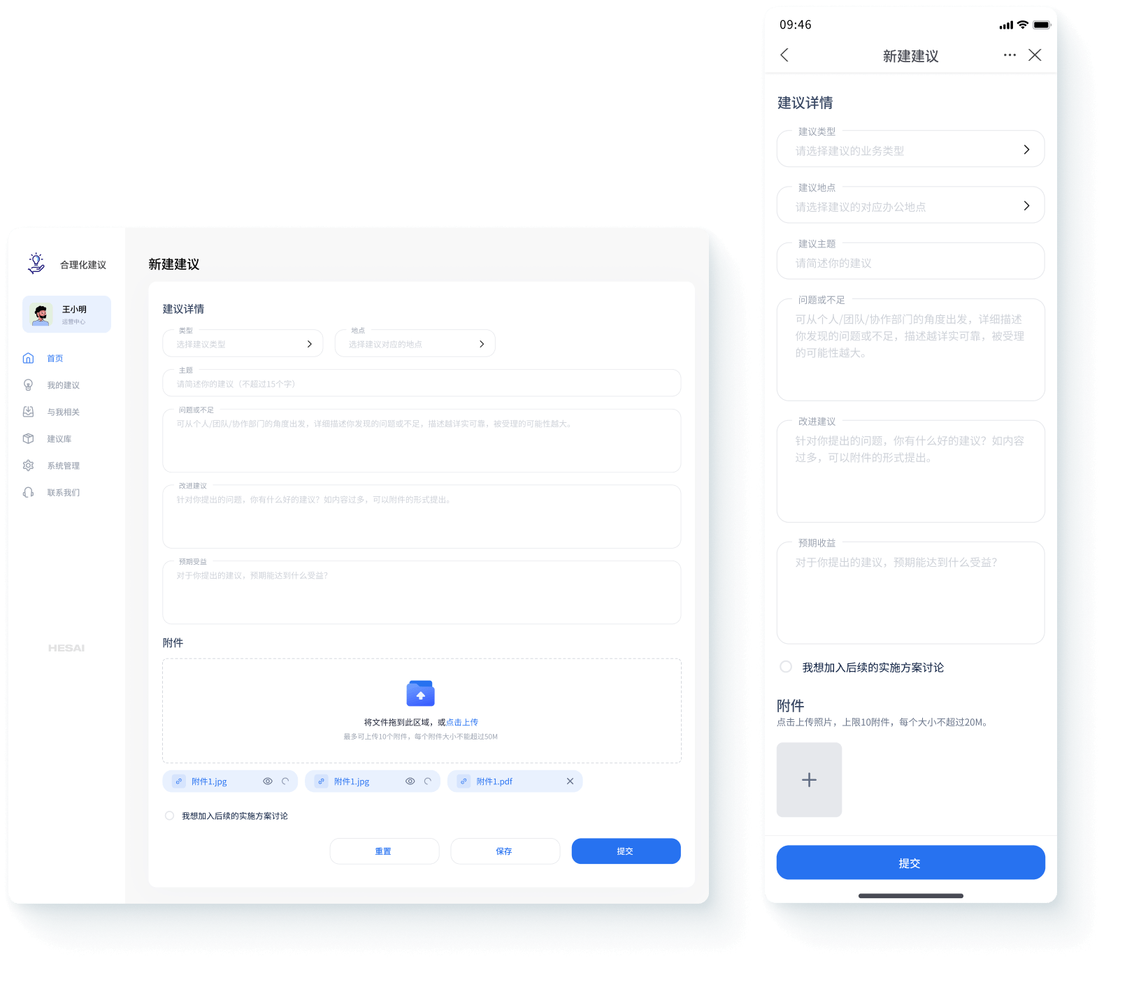 A structured form captures the problem, proposed improvement, and supporting details. After submission, real-time status updates replace the previous black box.
